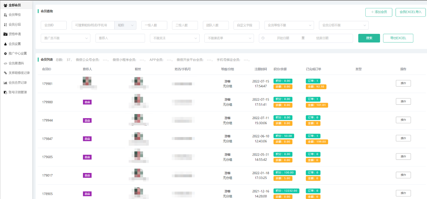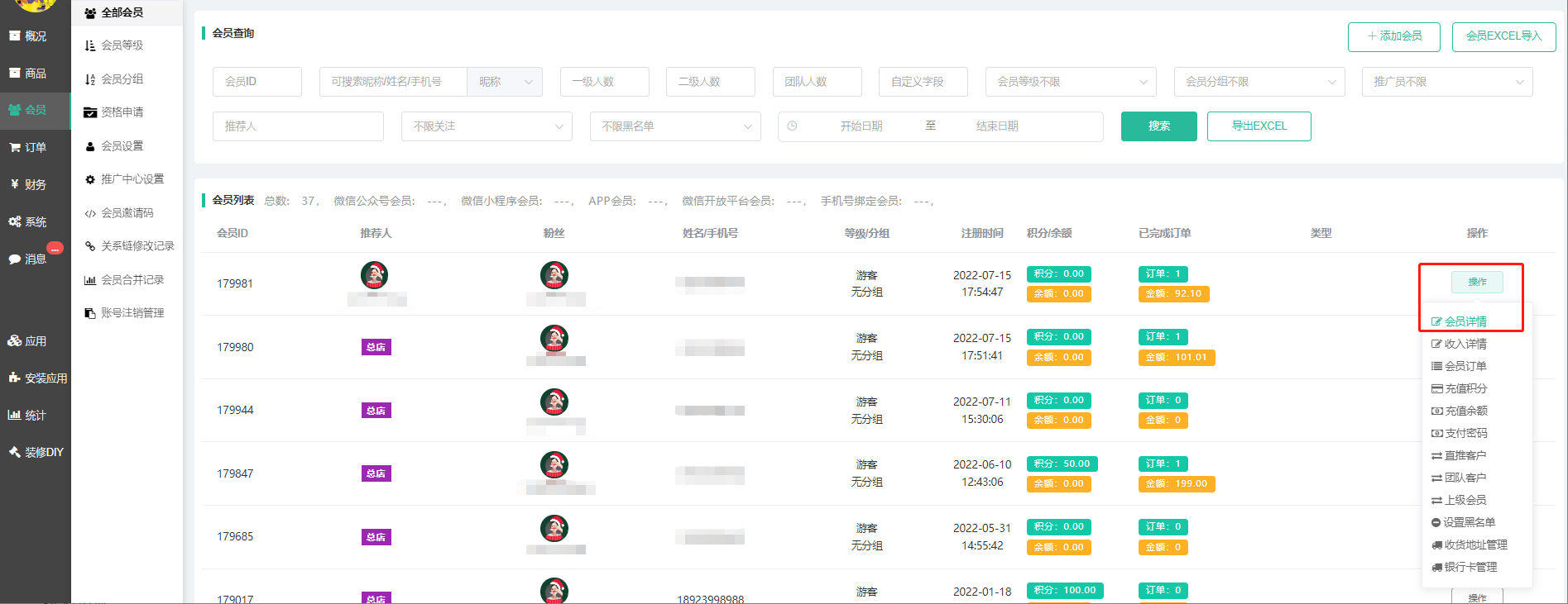 列表显示会员ID、推荐人信息、会员信息、姓名/手机号、等级/分组、注册时间、积分/余额、成交(按下单,订单数量、金额)、是否关注、操作;