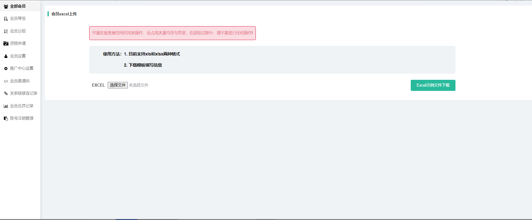 步骤:先下载excel示例文件模板表格,填写手机号和登录密码。其次返回商城后台,选择文件,导入excel文件,便成功导入手机号会员.