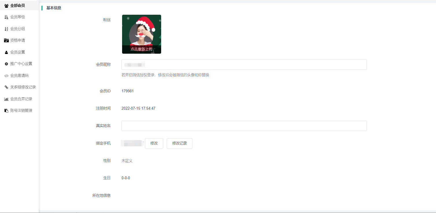 这里可查看到会员具体信息,有微信头像昵称、会员等级情况、会员分组信息、真实姓名、绑定的手机号码、支付宝姓名和账号信息、会员积分余额数、成交订单数、成交金额、注册时间、关注状态、黑名单状态,部分信息支持修改。