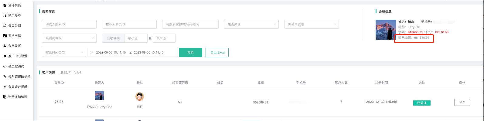 团队客户:搜索会员id,昵称/名称/手机号,页面查看会员关注、黑名单状态、层级和导出表格