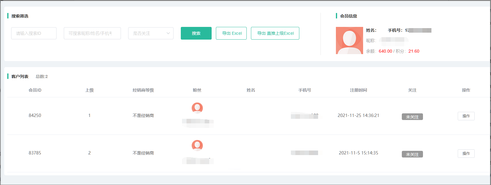 直推客户:搜索会员id,昵称/名称/手机号,页面查看会员关注、状态(会员前端申请推广员的审核状态)和黑名单状态和导出表格
