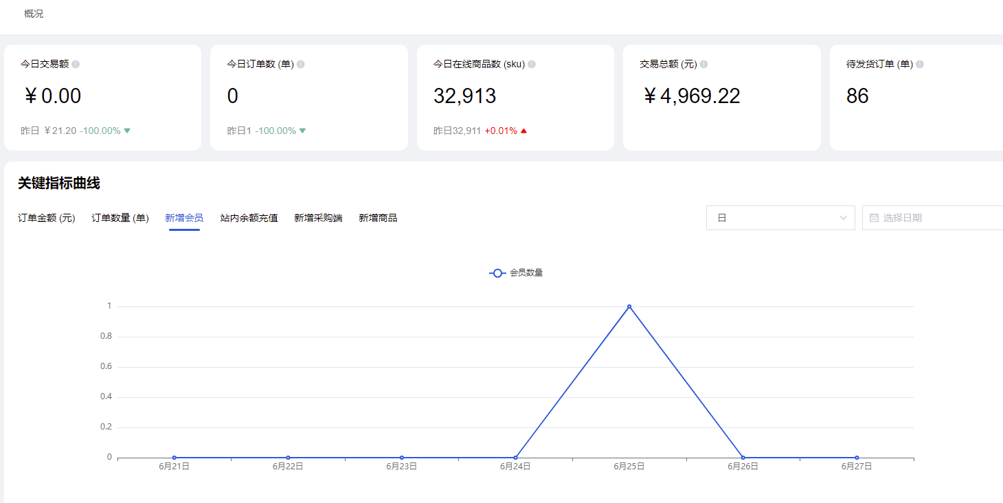 2)会员交易:今日新增订单总金额(已支付订单)。