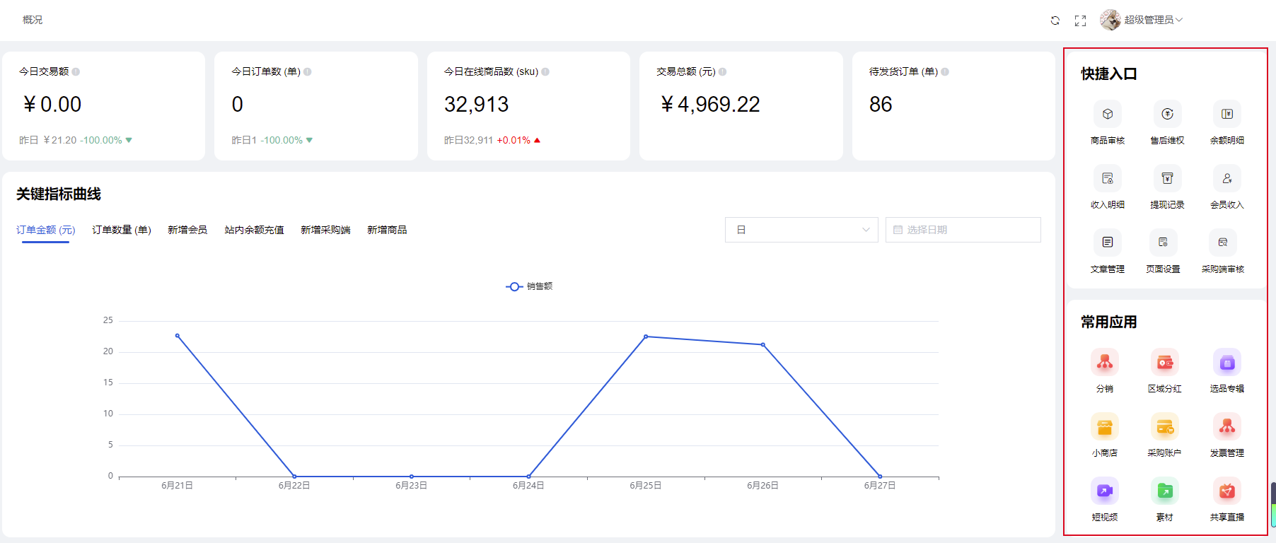 提供商品审核,售后维权,余额明细,收入明细,提现记录,会员收入,文章管理,页面设置,采购端审核等功能快速入,点击可进入对应设置页面