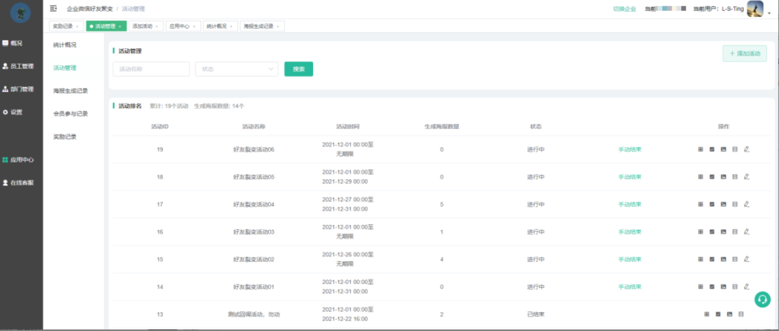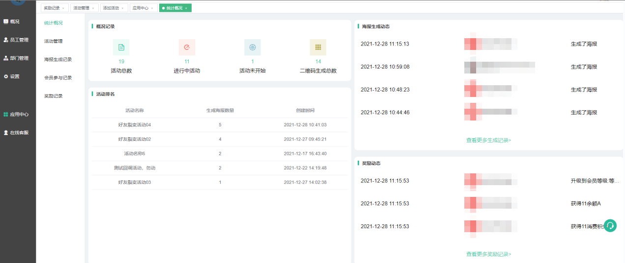 显示各个活动的概况,活动排名显示已生成海报的前10个活动
