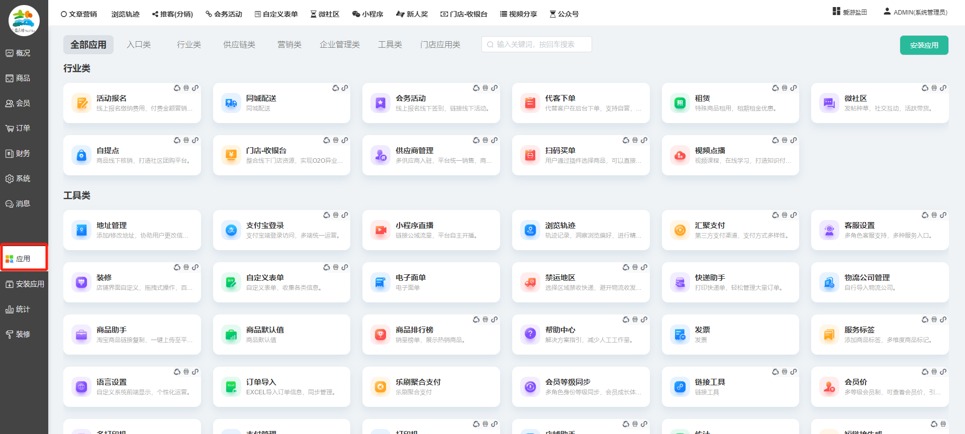 目录 搜索 展开 一、前期准备资料二、数字乡村码-上线操作指南1、服务号的申请流程及认证2、申请小程序流程3、开放平台绑定小程序和公众号三、数字乡村码-系统操作数字乡村码系统管理-概况数字乡村码-商品管理1、发布商品2、商品列表3、商品表单4、商品分类5、品牌管理6、配送模板7、评论管理8、优惠券管理9、商品标签10、退货地址设置11、满额优惠12、批量操作13、配送方式14、基础设置15、商品隐藏四、数字乡村码-会员管理1、全部会员2、会员等级3、会员分组4、资格申请5、会员设置6、推广中心设置7、会员邀请码8、会员关系链修改关系链修改记录9、会员合并记录10、账号注销管理11、会员设置中心五、数字乡村码-订单管理1、订单管理列表2、订单处理流程3、订单状态4、订单修改价格5、订单退款退货6、多包裹发货7、批量发货订单操作步骤8、催发货订单9、物流查询六、数字乡村码-财务管理1、余额设置2、会员余额3、充值记录4、转让记录5、余额明细6、收入明细7、提现设置8、提现统计9、积分管理10、转账审核11、收益广告12、批量充值七、数字乡村码-系统管理1、商城入口2、商城设置①、商城设置②、订单设置③、物流查询④、短信⑤、联系方式⑥、分类⑦、优惠券⑧、分享⑨、幻灯片⑩、广告位⑫、地图设置3、交易设置4、微信模板消息自定义消息模板(新版)自定义消息模板(旧版)小程序消息模板公众号模板消息变更公告5、语言设置6、权限管理7、多媒体管理八、数字乡村码-消息管理九、数字乡村码-应用管理十、数字乡村码系统-数据统计十一、数字乡村码-页面装修DIY1、模板管理2、店铺页面3、顶部导航4、底部导航5、DIY模板市场6、首屏广告7、基础设置8、装修DIY尺寸建议十二、供应商功能插件操作指南1、供应商2、门店-收银台门店申请和使用步骤门店管理①、门店-收银台 营销设置②、门店-收银台 分润设置门店分类门店申请门店审核门店商品门店商品订单收银台订单数据统计核销员基础设置默认设置门店装修3、微社区4、会务活动十三、营销插件操作指南活动报名提货卡新人奖微店问卷调查积分视频分享1、视频分享基础设置2、视频分享发现管理3、视频分享分类管理4、视频分享评论管理5、视频分享分红记录6、视频分享短视频中心每日红包幸运大抽奖签到优惠券二维码任务奖励优惠劵文章音频文章付费文章限时购新海报拓客卡操作流程积分活动素材中心视频红包十四、入驻门店应用类1、门店预约2、附近商品3、门店定位设置4、门店控制5、门店满额包邮6、门店满额减7、导入商品8、门店搜索9、门店股东10、核销券11、多门店核销1、商城后台设置2、前端功能演示十五、常见问题1、后台登录密码修改流程2、会员-余额,积分,后台如何进行充值与扣除3、如何修改上下级关系4、一种万能的获取商城小程序路径的方法 暂无相关搜索结果! 阅读次数:1444 本文档使用 模王系统 发布 九、数字乡村码-应用管理 九、商城管理-应用显示所有商城已安装并启用的应用,包含以下大类:具体根据自家商城后台系统显示为准。每个应用功能设置步骤较多,请查看相对应应用的学习文档。文档更新时间: 2024-01-08 10:36 作者:链上旅行