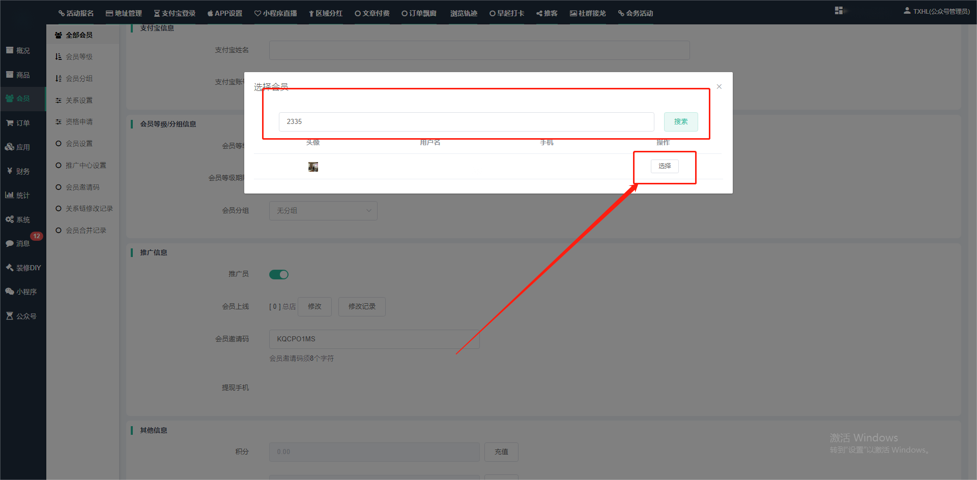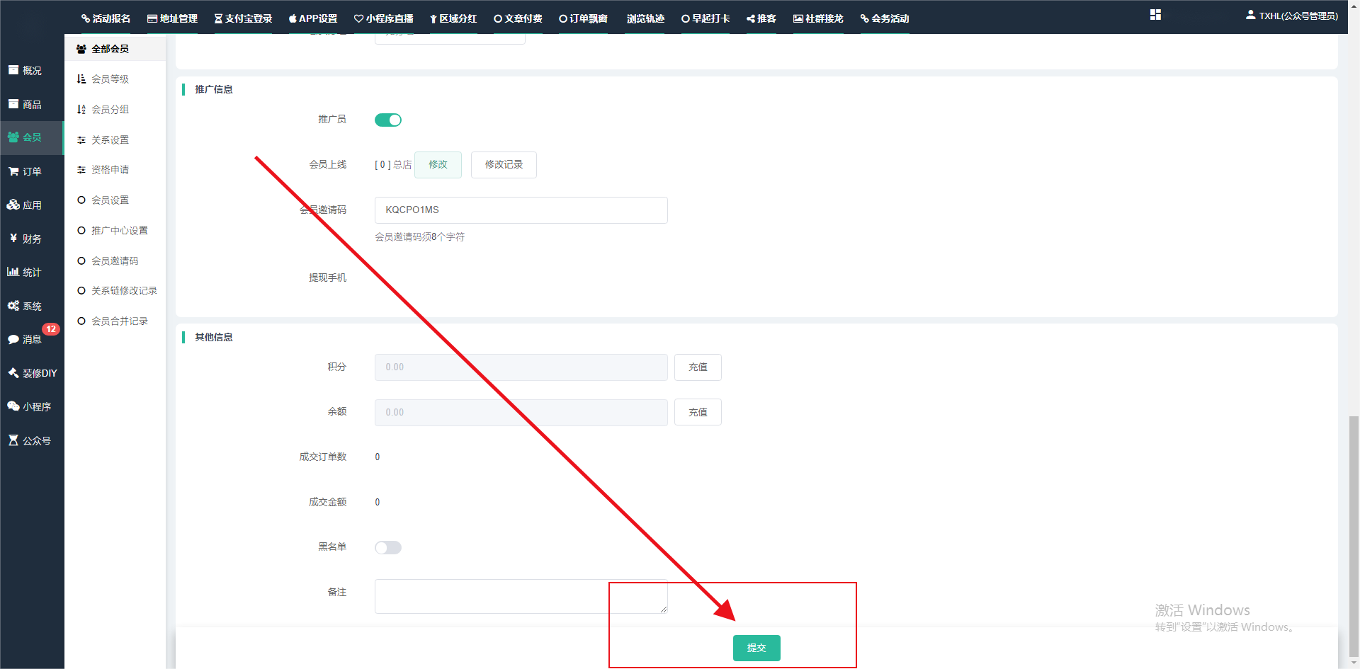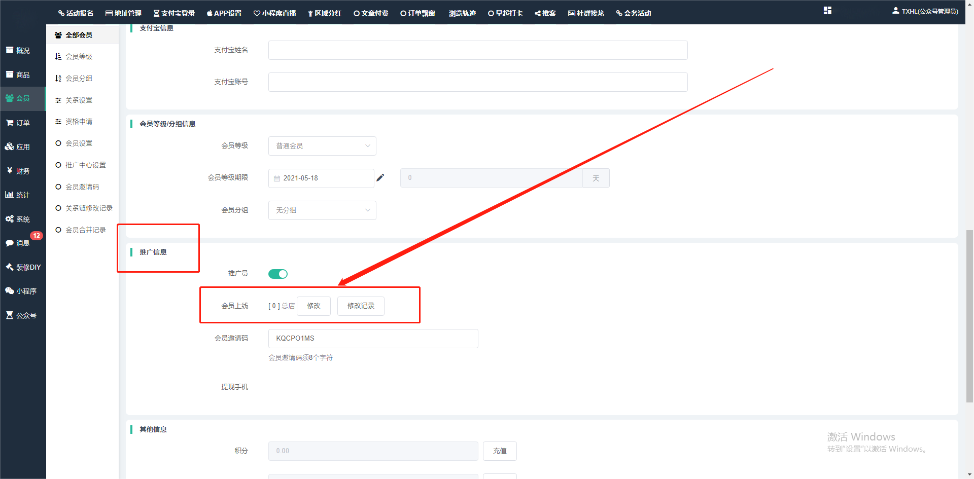 目录 搜索 展开 一、前期准备资料二、数字乡村码-上线操作指南1、服务号的申请流程及认证2、申请小程序流程3、开放平台绑定小程序和公众号三、数字乡村码-系统操作数字乡村码系统管理-概况数字乡村码-商品管理1、发布商品2、商品列表3、商品表单4、商品分类5、品牌管理6、配送模板7、评论管理8、优惠券管理9、商品标签10、退货地址设置11、满额优惠12、批量操作13、配送方式14、基础设置15、商品隐藏四、数字乡村码-会员管理1、全部会员2、会员等级3、会员分组4、资格申请5、会员设置6、推广中心设置7、会员邀请码8、会员关系链修改关系链修改记录9、会员合并记录10、账号注销管理11、会员设置中心五、数字乡村码-订单管理1、订单管理列表2、订单处理流程3、订单状态4、订单修改价格5、订单退款退货6、多包裹发货7、批量发货订单操作步骤8、催发货订单9、物流查询六、数字乡村码-财务管理1、余额设置2、会员余额3、充值记录4、转让记录5、余额明细6、收入明细7、提现设置8、提现统计9、积分管理10、转账审核11、收益广告12、批量充值七、数字乡村码-系统管理1、商城入口2、商城设置①、商城设置②、订单设置③、物流查询④、短信⑤、联系方式⑥、分类⑦、优惠券⑧、分享⑨、幻灯片⑩、广告位⑫、地图设置3、交易设置4、微信模板消息自定义消息模板(新版)自定义消息模板(旧版)小程序消息模板公众号模板消息变更公告5、语言设置6、权限管理7、多媒体管理八、数字乡村码-消息管理九、数字乡村码-应用管理十、数字乡村码系统-数据统计十一、数字乡村码-页面装修DIY1、模板管理2、店铺页面3、顶部导航4、底部导航5、DIY模板市场6、首屏广告7、基础设置8、装修DIY尺寸建议十二、供应商功能插件操作指南1、供应商2、门店-收银台门店申请和使用步骤门店管理①、门店-收银台 营销设置②、门店-收银台 分润设置门店分类门店申请门店审核门店商品门店商品订单收银台订单数据统计核销员基础设置默认设置门店装修3、微社区4、会务活动十三、营销插件操作指南活动报名提货卡新人奖微店问卷调查积分视频分享1、视频分享基础设置2、视频分享发现管理3、视频分享分类管理4、视频分享评论管理5、视频分享分红记录6、视频分享短视频中心每日红包幸运大抽奖签到优惠券二维码任务奖励优惠劵文章音频文章付费文章限时购新海报拓客卡操作流程积分活动素材中心视频红包十四、入驻门店应用类1、门店预约2、附近商品3、门店定位设置4、门店控制5、门店满额包邮6、门店满额减7、导入商品8、门店搜索9、门店股东10、核销券11、多门店核销1、商城后台设置2、前端功能演示十五、常见问题1、后台登录密码修改流程2、会员-余额,积分,后台如何进行充值与扣除3、如何修改上下级关系4、一种万能的获取商城小程序路径的方法 暂无相关搜索结果! 阅读次数:1418 本文档使用 模王系统 发布 3、如何修改上下级关系 如何修改上下级关系一.如何修改上下级关系?1.会员-全部会员-可以通过搜索用户的独立ID,或者用户微信昵称,找到此会员,然后点击右边的(操作)2.再点击会员详情。3.滑到下面,有个推广信息-会员上线,点击修改4.输入上级的ID号,点击搜索,出来此上级会员后点击选择。5.滑到最下面,一定要点击提交按钮。文档更新时间: 2024-01-05 14:50 作者:链上旅行