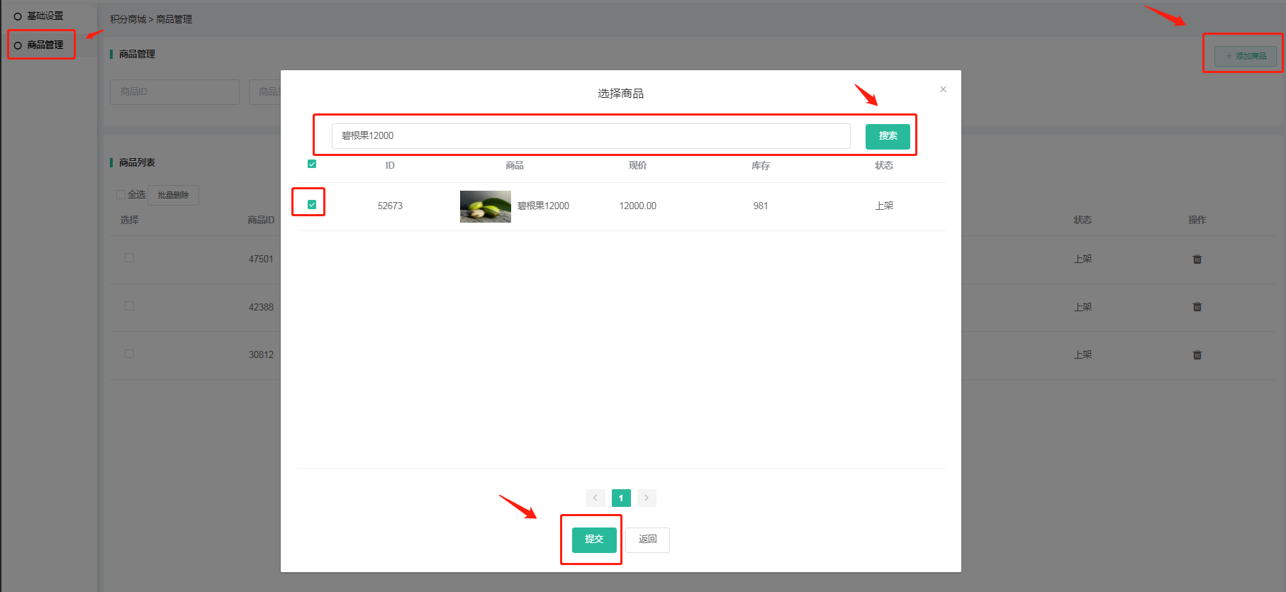 2:商品管理-点增加商品-输入积分全额抵扣商品名称-搜索-选择-提交-