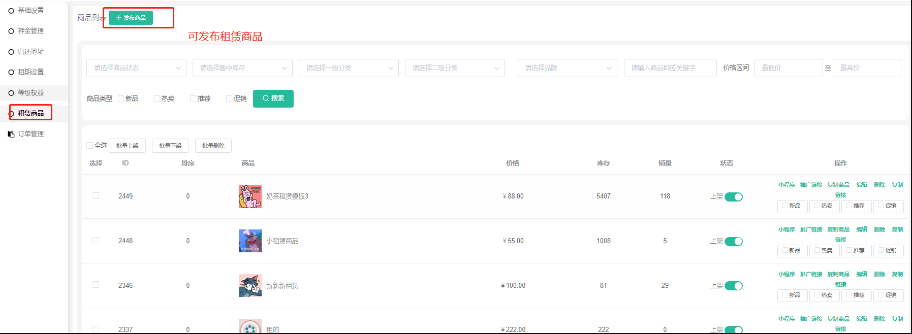 商品设置为租赁商品后只能在租赁插件-租赁商品中进行管理。