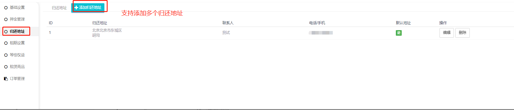 支持添加多个归还地址:联系人、手机、邮编、归还地址、是否默认地址,用户归还租赁商品时可以选择归还到添加的任意地址。